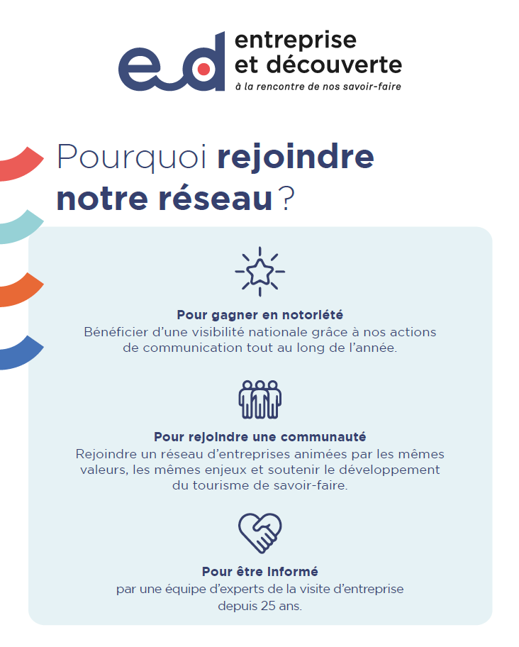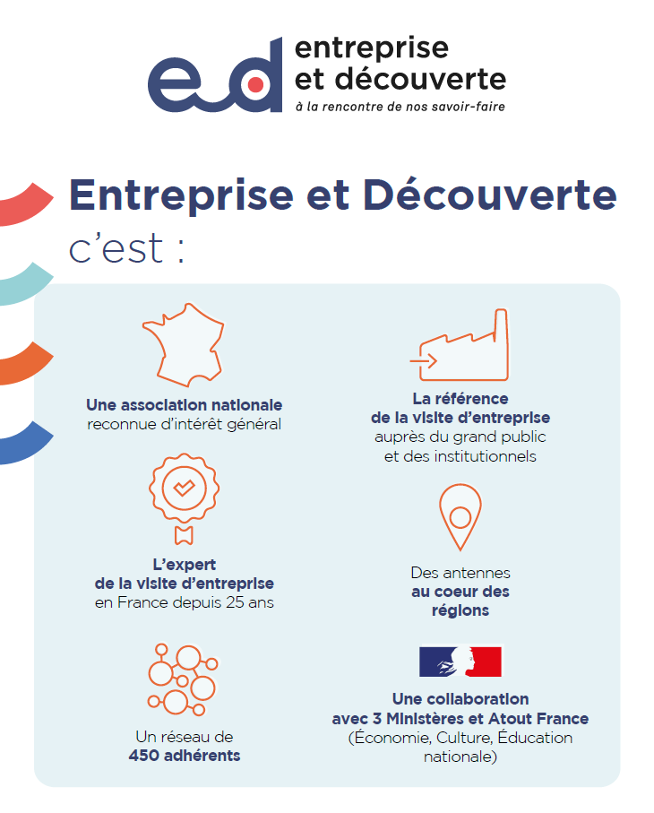 Entreprise et Découverte est l’association nationale de la visite d’entreprise. Sa mission est la communication et le développement de la visite d’entreprise ou tourisme de savoir-faire en France. Valoriser les savoir-faire et les engagements RSE des entreprises, promouvoir le Fabriqué en France dans les territoires… autant de valeurs que nous défendons à travers la pratique de la visite d’entreprise !