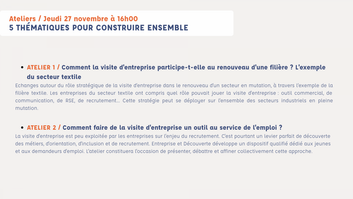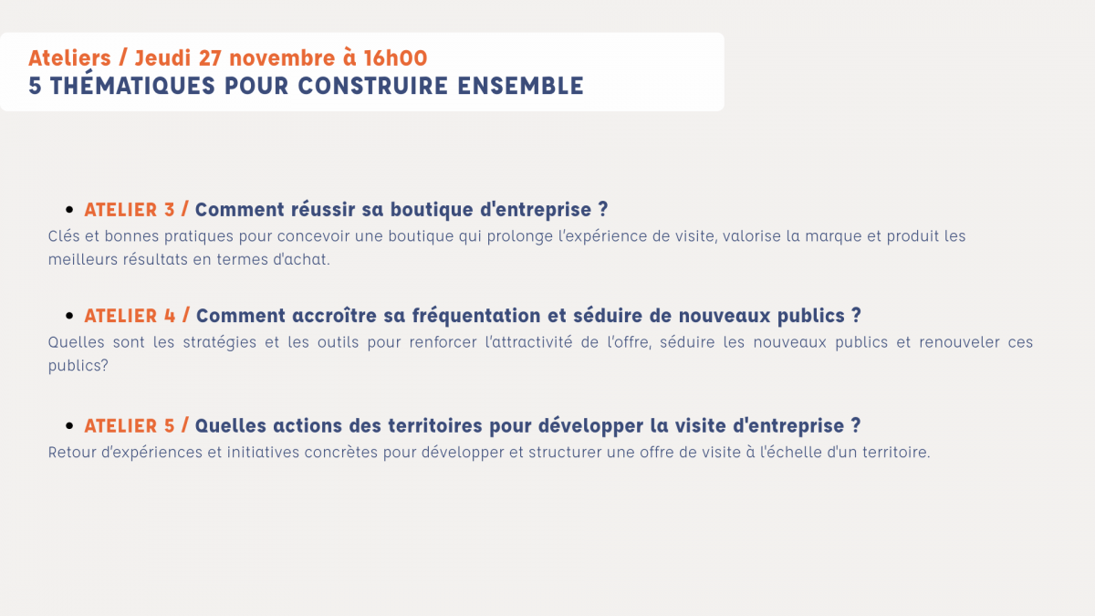Bien plus qu’une simple ouverture au public, la visite d’entreprise est un levier stratégique au service de la marque, de l’attractivité des métiers et de la valorisation des savoir-faire. Cette table ronde explorera la manière dont la visite répond aux enjeux globaux des entreprises, dans une approche à 360°.