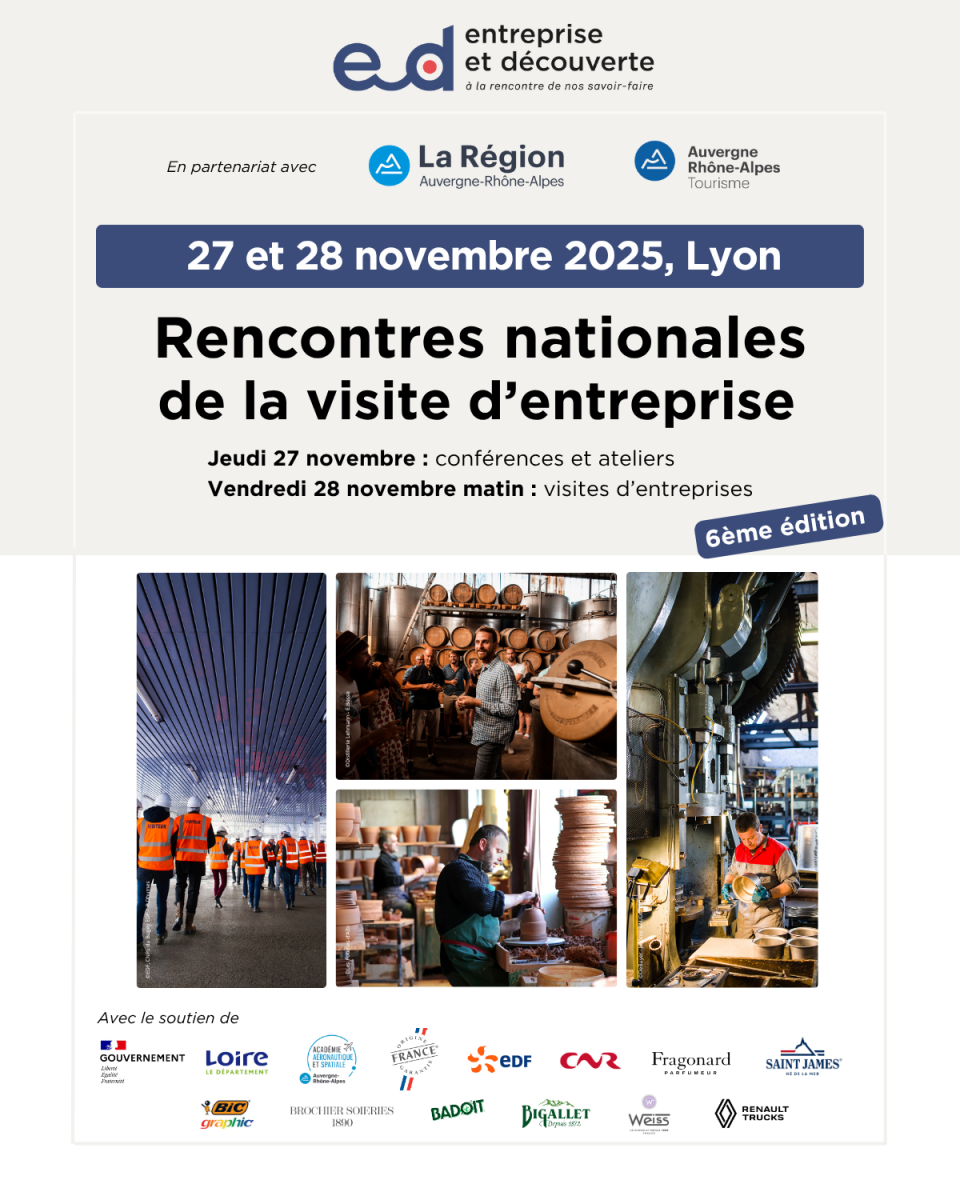 LE rendez-vous des acteurs de la visite d’entreprise en France ! Organisé par Entreprise et Découverte, en partenariat avec la Région Auvergne-Rhône-Alpes et Auvergne-Rhône-Alpes Tourisme, RDV les 27 et 28 novembre 2025 à Lyon pour cette 6ème édition.