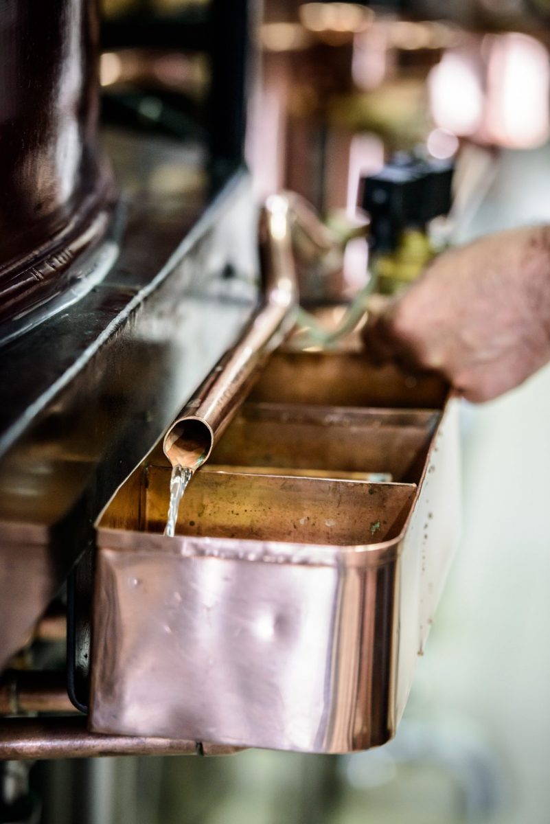 La distillation s’effectue donc dans les alambics charentais, en deux temps. Il faut compter deux chauffes successives : la chauffe et la bonne chauffe. Ces eaux-de-vie sont ensuite destinées à vieillir en fûts de chêne, pour finalement donner du cognac.