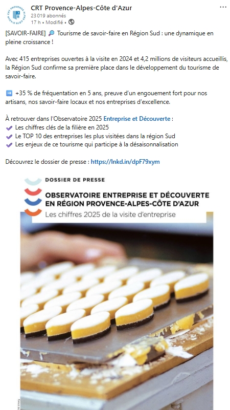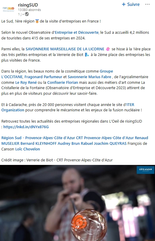 - 22 millions de visiteurs : une augmentation très significative de 30% de visiteurs en 5 ans. Le tourisme de savoir-faire s’inscrit désormais dans le paysage culturel français au même titre que les églises, châteaux et musées.
